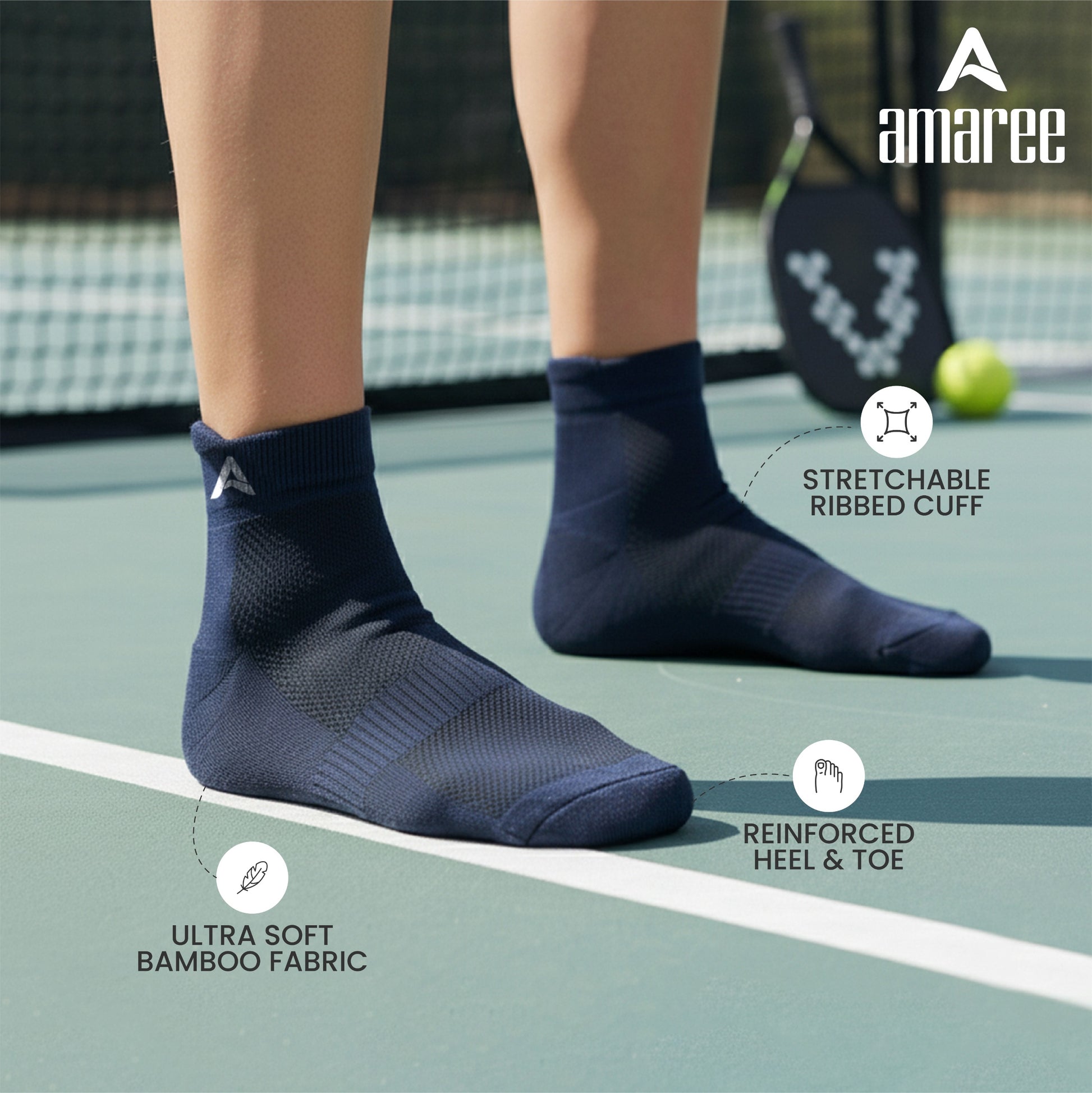 Amaree’s Performance Bamboo Socks in ankle length combine advanced design with eco-friendly materials for athletes and outdoor enthusiasts. Crafted from breathable bamboo fabric, these socks offer natural odor resistance and moisture control, keeping your feet dry during intense gym sessions, hiking, running, or cycling.